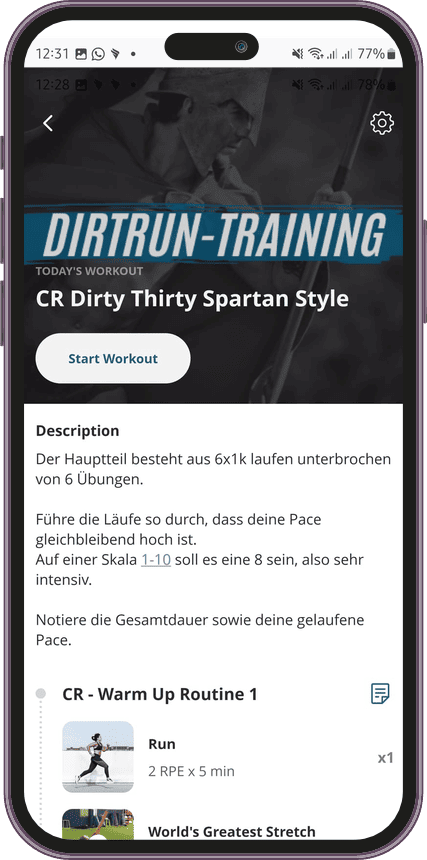 Mit meiner App erhältst du einen individuellen Trainingsplan, perfekt abgestimmt auf dich und deinen nächsten Dirtrun. Trainiere jederzeit und überall, ob Anfänger oder Profi. Dein Schlüssel zum Dirtrun-Erfolg und persönlichen Draht – immer griffbereit!