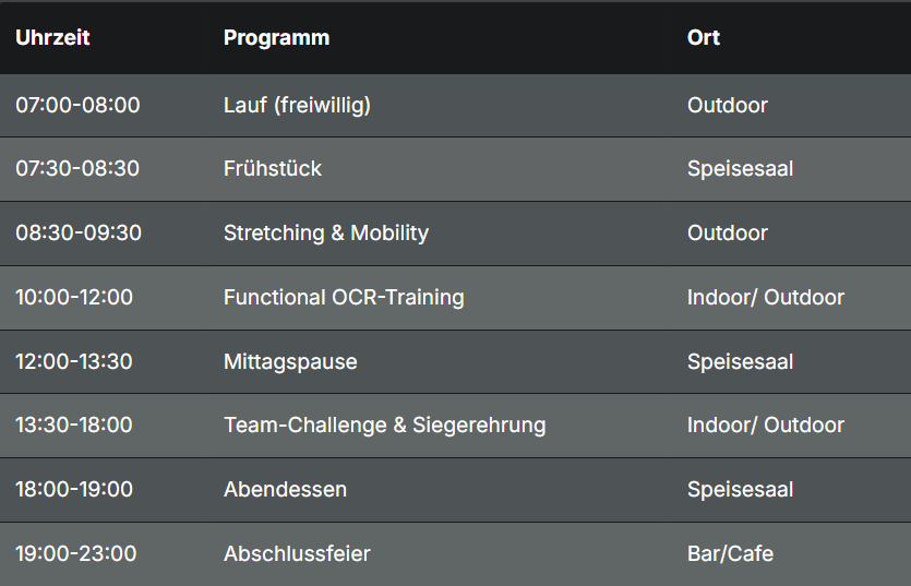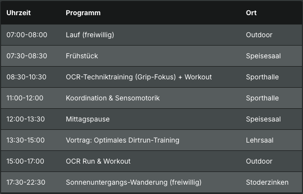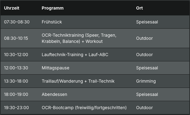 Unser OCR‑Trainingscamp verbindet Abenteuer mit Methodik: Perfekt für Einsteiger, die den Einstieg sicher und motivierend wollen, und für Fortgeschrittene, die Performance und Technik spürbar verbessern möchten.
