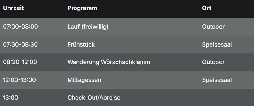 Es wird die zeitliche Flexibilität geben, kleinere Ausflüge machen zu können. Im Fokus steht aber das Trainingsprogramm, um unseren Worten auch Taten folgen zu lassen -> dich auf dein nächstes Level zu bringen.